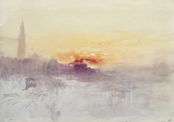 Joseph Mallord William Turner, Venice at Sunrise from the Hotel Europa, with the Campanile of San Marco, ca. 1840. Watercolor on paper. Tate, accepted by the nation as part of the Turner Bequest, 1856, D35949. Image © Tate, London 2015