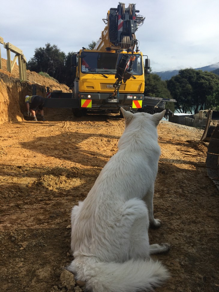 But the crane’s arrival was a breeze! So we’re over the first hurdle! Our Swiss Shepherd, Koa loves diggers and cranes! She’s always there keeping an eye on things.